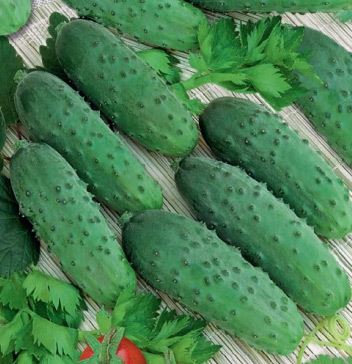 Среднеранний (40-45 дня) партенокарпический гибрид для весеннее-летних теплиц и пленочных укрытий. Растение мощное, сильнорослое, среднеплетистое, с пучковым расположением завязей, формирует в каждом узле от 3-4 до 6-8 красивых огурчиков. Зеленцы короткие, выравненные, цилиндрические, крупнобугорчатые, зеленые с короткими светлыми полосами, с маленькими семенными камерами, длиной 8-10 см, с тонким ароматом, хрустящие, плотные, не перерастают. Ценность гибрида: интенсивная отдача раннего урожая, высокие товарные и технологические качества. Рекомендуется для употребления в свежем виде, засолки и консервирования.
